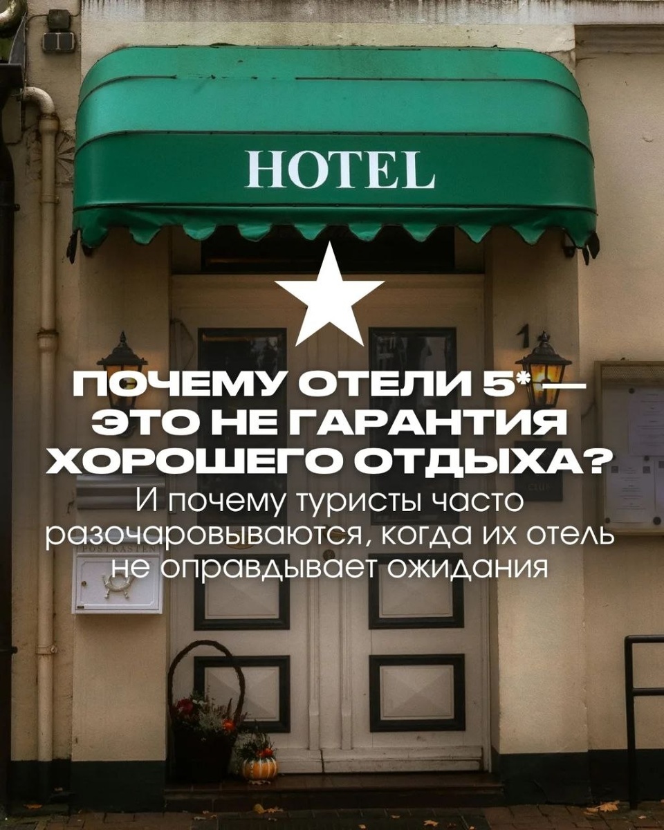 ? И почему туристы часто разочаровываются, когда их отель не оправдывает ожидания ПЯТИЗВЁЗДОЧНЫЕ ОТЕЛИ БЫВАЮТ РАЗНЫХ КАТЕГОРИЙ — есть бюджетные пятёрки — есть премиум варианты — а есть отели экстра люкс и разница между ними — огромная Один отель 5* может быть совершенно простым, с стандартными номерами и базовым питанием В то время как другой отель 5* может быть очень стильным, современным, с люксовой косметикой, премиальным питанием и совершенно другим сервисом НО ПОЧЕМУ У ОБОИХ ОТЕЛЕЙ СТОИТ ПОМЕТКА 5*? Звёздность отелей — это про соответствие стандартам Например, чтобы получить 5 звёзд, отелю обязательно нужен спортзал, определённое количество номеров, типы размещения, включая семейные комнаты, а также соблюдать ряд технических требований Но наличие всех этих требований не делает отель премиальным ПОЭТОМУ ПРИ ПОДБОРЕ ОТЕЛЯ ВАЖНО УЧИТЫВАТЬ: — к какой категории относится отель — уровень его сервиса — и другие нюансы, которые не видны на первый взгляд МАЛО ВЫБИРАТЬ ОТЕЛЬ ПР