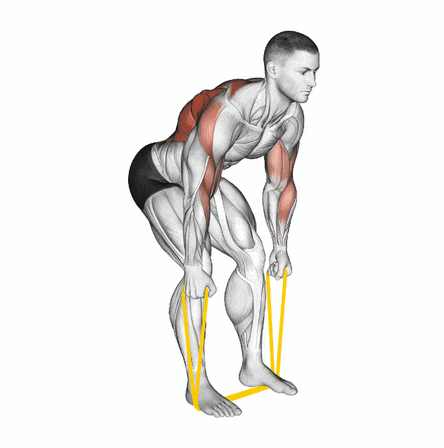 - Исходное положение. Встаньте прямо, стопы расположите на ширине плеч. Закрепите резинку под стопами, равномерно натяните её. Возьмите ручки резинки нейтральным хватом (ладони обращены друг к другу). Наклоните корпус вперёд примерно на 45°, сохраняя спину прямой. Руки опущены вниз, локти слегка согнуты. Плечи опущены, лопатки сведены, взгляд направлен в пол перед собой. Мышцы кора напряжены.