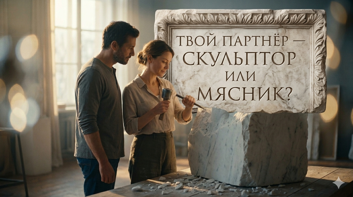 Скульптор не бьёт молотом куда попало. Он убирает то, что мешает. Ваша задача не критиковать партнёра за его недостатки (это долбление по мрамору), а помогать убирать то, что мешает его идеальному Я. Пример. Его идеальное Я «уверенный в себе». Мешает страх публичных выступлений. Вместо «ты вечно мямлишь» скажи: «Я вижу, тебе страшно. Давай отрепетируем речь передо мной. Я помогу».