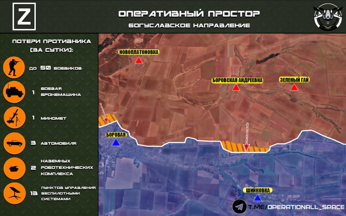 п. Шийковка. 🔻Штурмовые подразделения #1_танковой_армии ГВ «Запад» при поддержке ударных дронов продолжают зачистку зданий на северных окраинах н.п. Боровая. Оперативный простор 👻Мы в MAX! Карта носит ориентировочный характер и может быть скорректирована по мере поступления новых данных.
