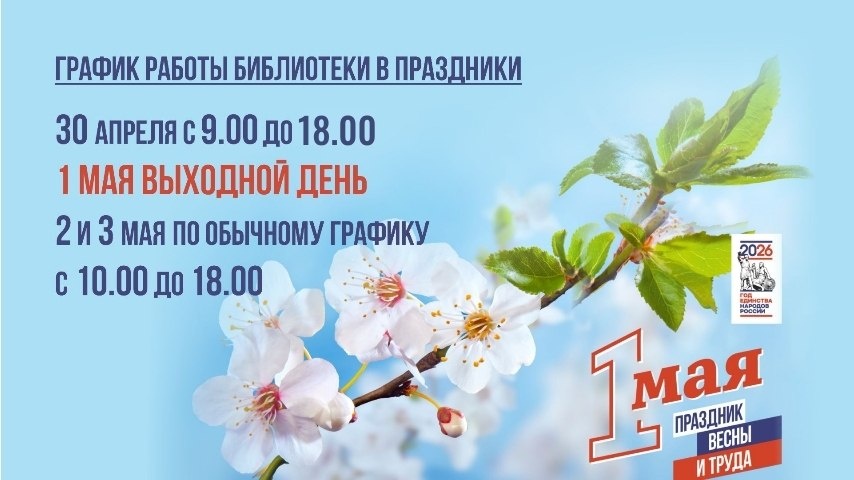 ! ✅ 30 апреля - с 9.00 до 18.00 ✅ 1 мая - ВЫХОДНОЙ ДЕНЬ ✅ 2 и 3 мая - по обычному графику с 10.00 до 18.00 📚 Планируйте своё посещение библиотеки заранее! Мы будем рады вас видеть!