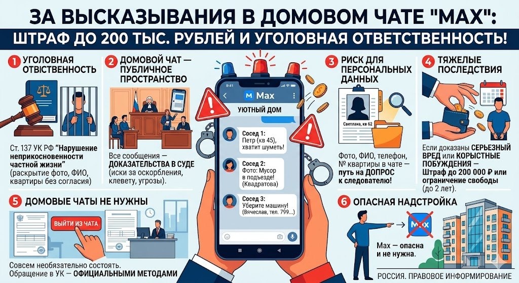 рублей Уголовная ответственность за высказывания в домовых чатах мессенджера Мах может наступить по ст. 137 УК РФ «Нарушение неприкосновенности частной жизни». ✅ Домовые чаты квалифицируются как публичное пространство, а сообщения в них могут использоваться в суде в качестве доказательств. ✅ Фото, имя и отчество, номер квартиры, телефон — всё это персональные данные, за которые можно оказаться на допросе у следователя. ✅ Если пострадавший докажет, что высказывания причинили серьёзный вред или были совершены из корыстных побуждений, высказывание в домовом чате Мах закончится штрафом до 200 тыс. рублей. Домовые чаты не предназначены для общения, и в них совсем необязательно состоять. Обращение в управляющую компанию направляются совсем другими методами. 🇷🇺 Мах — не просто ненужная надстройка, но ещё — и опасная. Telegram: @okolobaikala Мах: max.ru/okolo_baikala ВК: https://vk.com/okolo_baikala Дзен: https://www.dzen.ru/okolobaikala ОК: https://ok.ru/group/70000010825331
