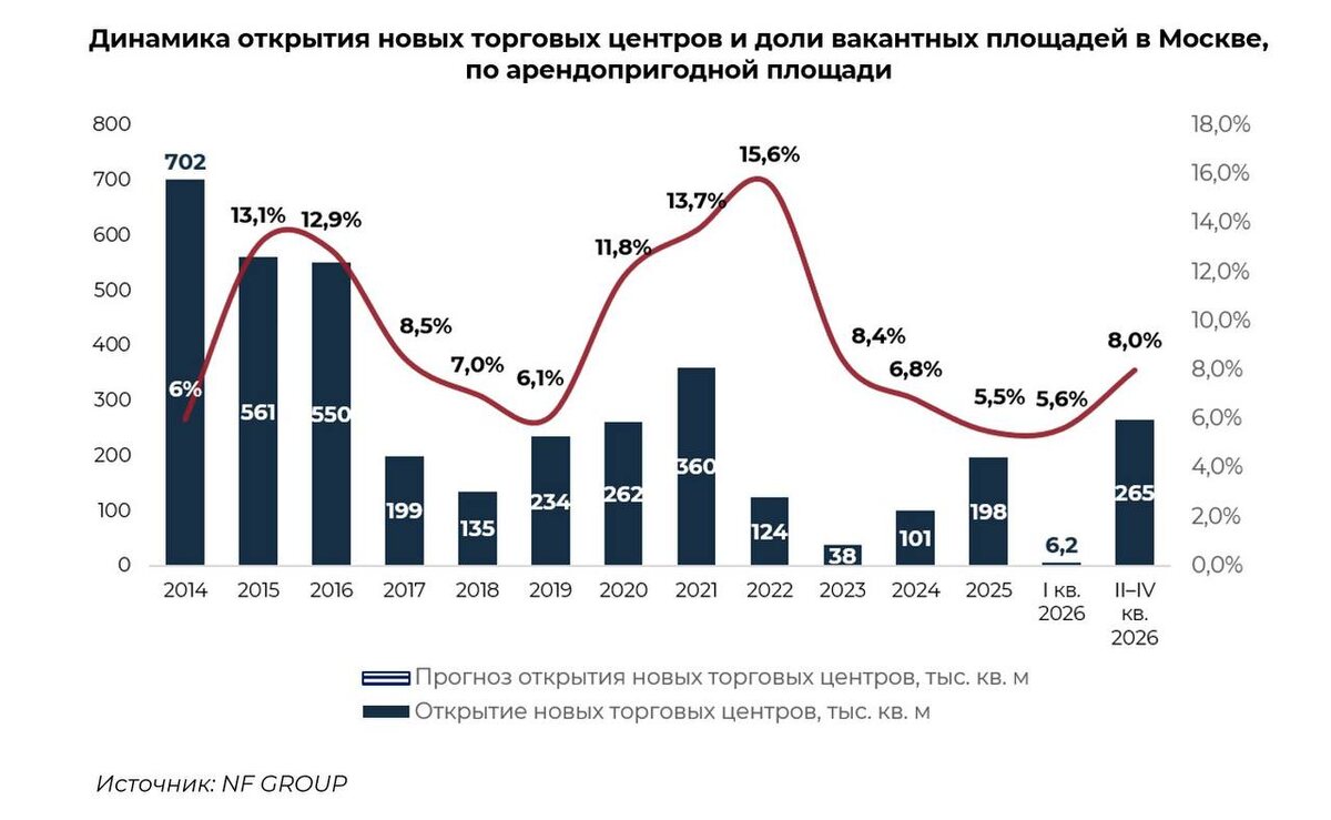 📊 По итогам марта 2026 года рынок торговой недвижимости столицы демонстрирует осторожный оптимизм! 🔎 По данным NF GROUP, объём ввода новых объектов составил: 9,5 тыс. кв. м — по показателю GBA; 6,2 тыс. кв. м — по GLA. 📏 Позитивная динамика прослеживается и в уровне вакантности: показатель снизился до 5,6 % — это на 1,2процентных пункта меньше, чем год назад. Правда, результат чуть превышает показатель 2025 года (5,5 %), но разница несущественна. 📉 Что ждёт рынок до конца года? Эксперты прогнозируют рост ключевых показателей: 🔮 общий объём предложения может увеличиться с 15,1 млн кв. м (GBA) и 7,8 млн кв. м (GLA) до 15,6 млн и 8,1 млн кв. м соответственно; уровень вакантности, с учётом нового строительства, может вырасти до 8 %. 📈 🧩 Вывод: рынок постепенно восстанавливается — ввод новых площадей сдержанный, а снижение вакантности говорит о стабильном спросе. Для инвесторов и арендаторов сейчас хорошее время изучить предложения: баланс спроса и предложения пока остаётся комфо