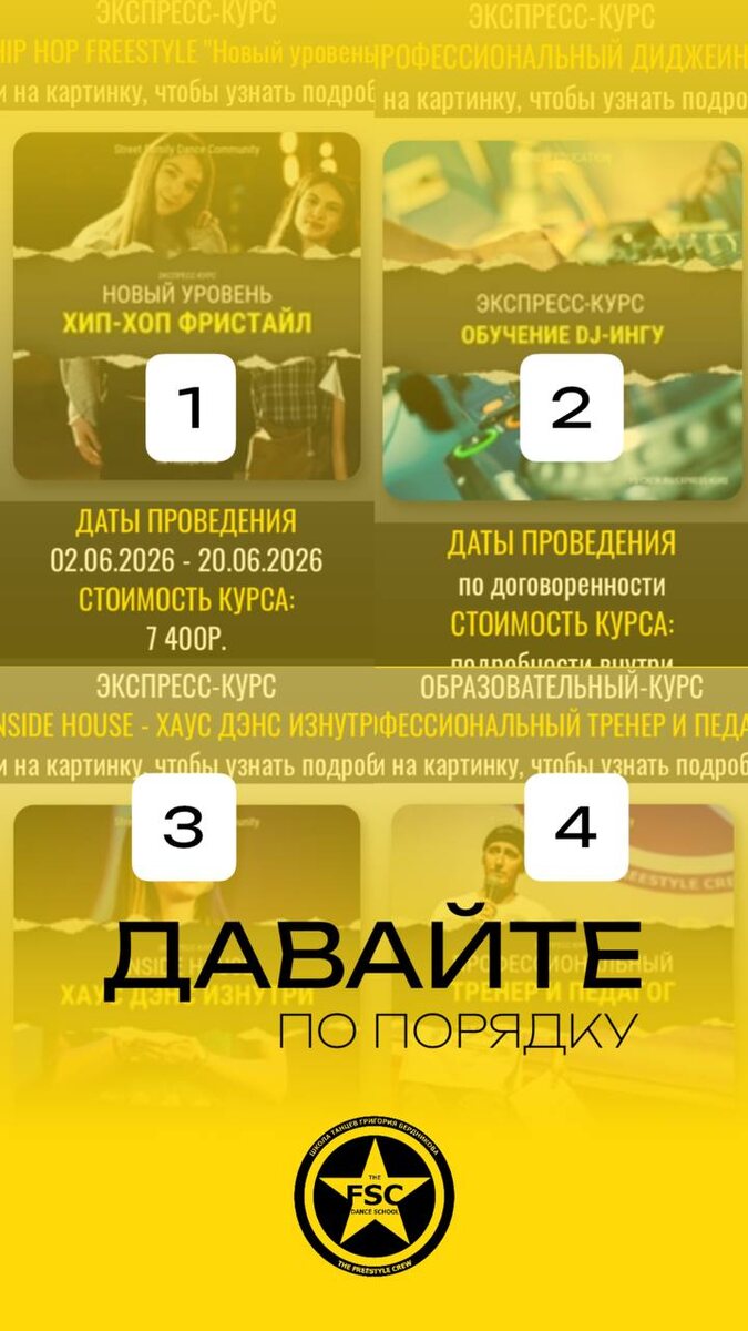 ? 🔥 Записывайтесь на экспресс‑курс от FSCREW — раскройте свой потенциал в танцах и диджеинге под руководством профессионалов! Что вас ждёт: ✔️ 6–8 занятий по 1–1,5 часа с квалифицированным специалистом; ✔️ детальный разбор движений — от базовых до эффектных фишек; ✔️ дополнительные аудио‑ и видеоматериалы для самостоятельной отработки; ✔️ закрытые чаты курсов — здесь будут все записи и обучающий контент; ✔️ итоговая видеозапись клипа со всеми участниками — на долгую память! 📅 Выбирайте направление и даты: 1. HIP HOP FREESTYLE «Новый уровень» • Даты: 02.06.2026 – 20.06.2026 • Стоимость: 7 400 ₽ 2. INSIDE HOUSE — ХАУС ДЭНС ИЗНУТРИ • Даты: 02.06.2026 – 20.06.2026 • Стоимость: 7 400 ₽ 3. ОБРАЗОВАТЕЛЬНЫЙ КУРС «ПРОФЕССИОНАЛЬНЫЙ ТРЕНЕР И ПЕДАГОГ» • Даты: 02.06.2026 – 18.06.2026 • Стоимость: 8 100 ₽ 4. ЭКСПРЕСС‑КУРС «ПРОФЕССИОНАЛЬНЫЙ ДИДЖЕИНГ» • Даты: по договорённости • Стоимость: подробности внутри Лето может быть продуктивным — и очень интересным! 📌 Всё подробно — по ссылке: http