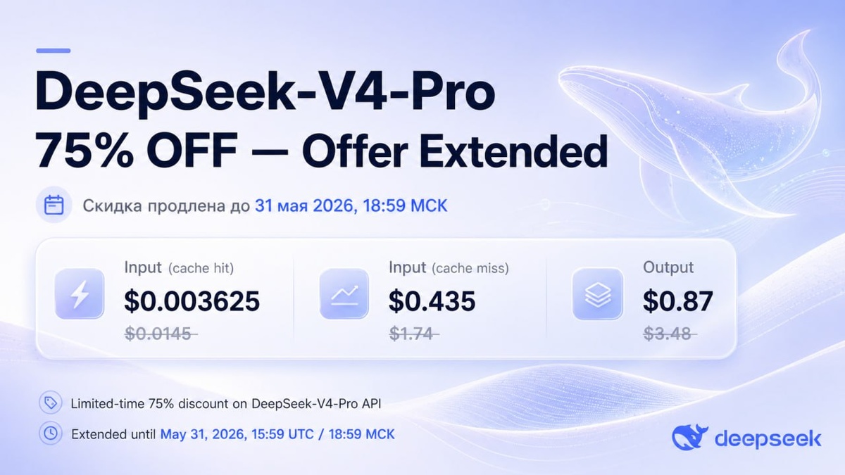 Теперь скидка 75% действует до 31 мая 2026 года, 18:59 по МСК. Изначально акция должна была закончиться 5 мая, но срок продлили. По их информации, продление уже отражено и в документации. Для разработчиков и команд это повод не откладывать тесты, если DeepSeek-V4-Pro уже был в планах на май. #DeepSeek