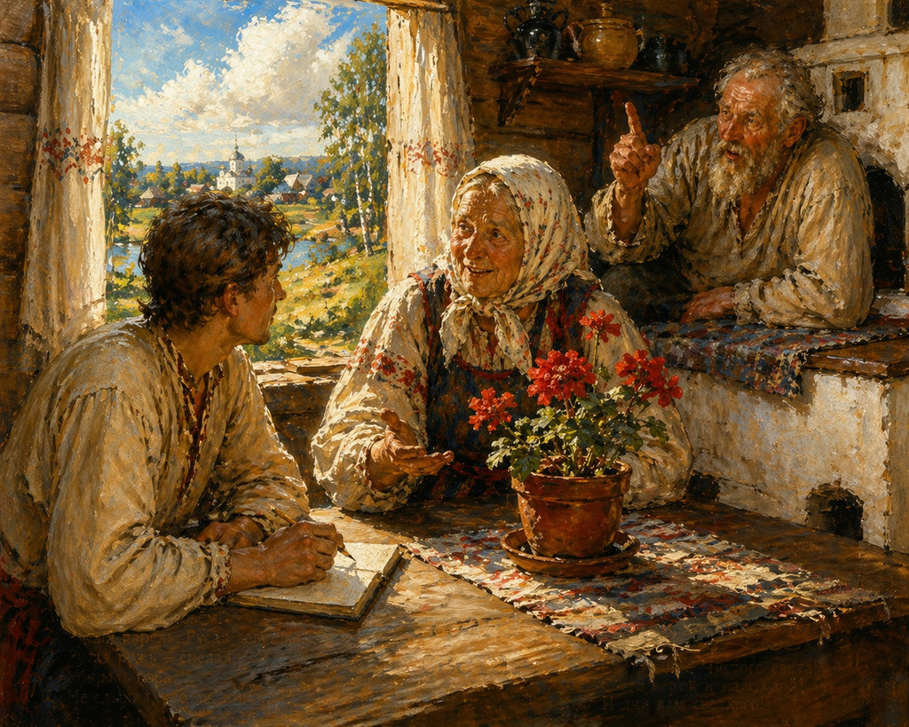 Есть у слова «Русь» и ещё одно значение, которое я не вычитал в книгах, а услышал из первых уст от живого человека. На севере, за лесами, за болотами, встречаются деревни, где старые люди говорят по-старинному. Почти так же, как тысячу лет назад. Тихо-смирно я жил в такой деревне и ловил старинные слова. Моя хозяйка Анна Ивановна как-то внесла в избу горшок с красным цветком. Говорит, а у самой голос подрагивает от радости: — Цветочек-то погибал. Я его вынесла на русь — он и зацвёл! — На русь? — ахнул я. — На русь, — подтвердила хозяйка. — На русь?! — На русь. Я молчу, боюсь, что слово забудется, упорхнёт, — и нет его, откажется от него хозяйка. Или мне послышалось? Записать надо слово. Достал карандаш и бумагу. В третий раз спрашиваю: — На русь?.. — На русь, соколик, на русь. На самую, что ни на есть, русь. Осторожней осторожного спрашиваю: — Анна Ивановна, не обидитесь на меня за назойливость? Спросить хочу. — Не буду, — обещает она. — Что такое — русь? Не успела она и рта открыть