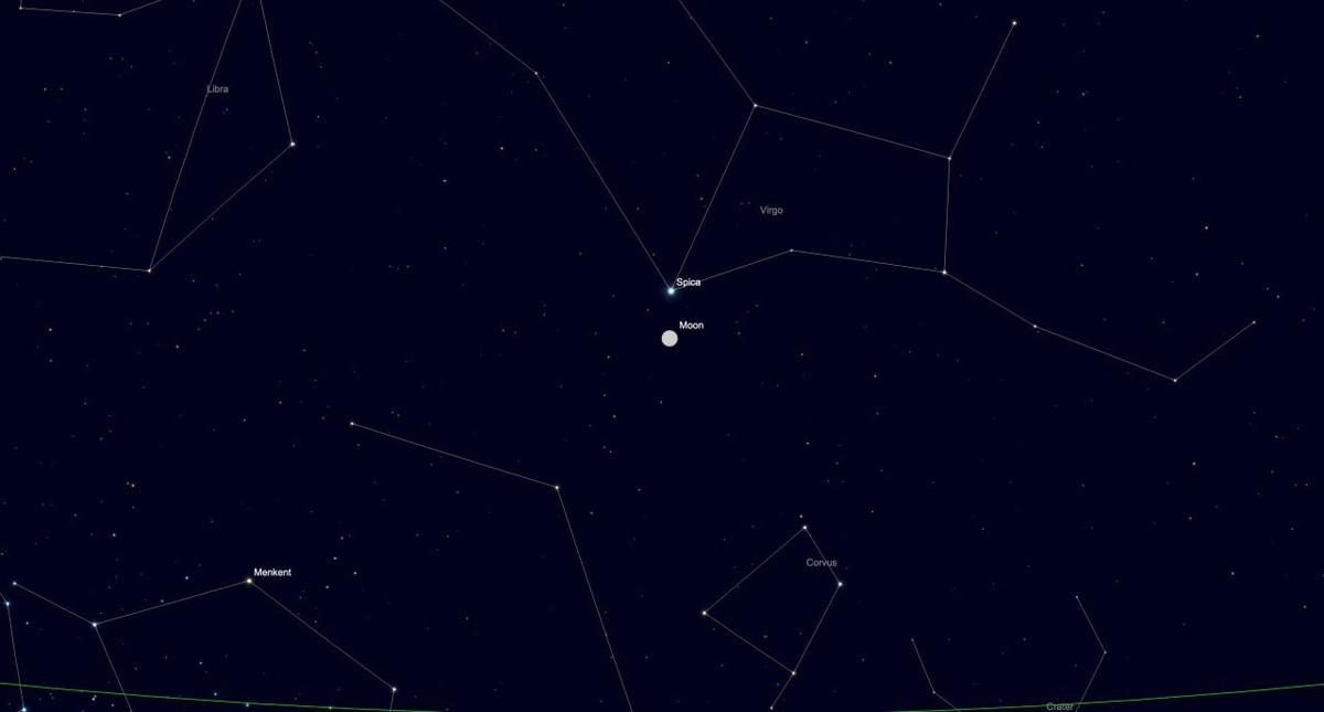30 апреля Спика (зв. вел. 1,0) будет сиять рядом почти с полной Луной, освещенной на 98%. Спика будет находиться примерно в 2° к северу от Луны. Эту яркую пару можно будет наблюдать большую часть ночи. Спика — одна из самых ярких звезд на ночном небе и самая яркая звезда в созвездии Девы. На самом деле это тесная двойная система. Две звезды расположены так близко друг к другу, что их невозможно разделить даже в телескоп. Их двойную природу можно выявить только с помощью спектроскопических методов. Эта звезда представляет интерес для астрономов-любителей, поскольку входит в астеризм «Бриллиант Девы», состоящий из Арктура (в созвездии Волопаса), Денеболы (в созвездии Льва), Сердца Карла (в созвездии Гончих Псов) и Спики (в созвездии Девы). Спика — надежный ориентир в этом огромном астеризме для поиска скопления галактик в Деве. #астрономический_календарь