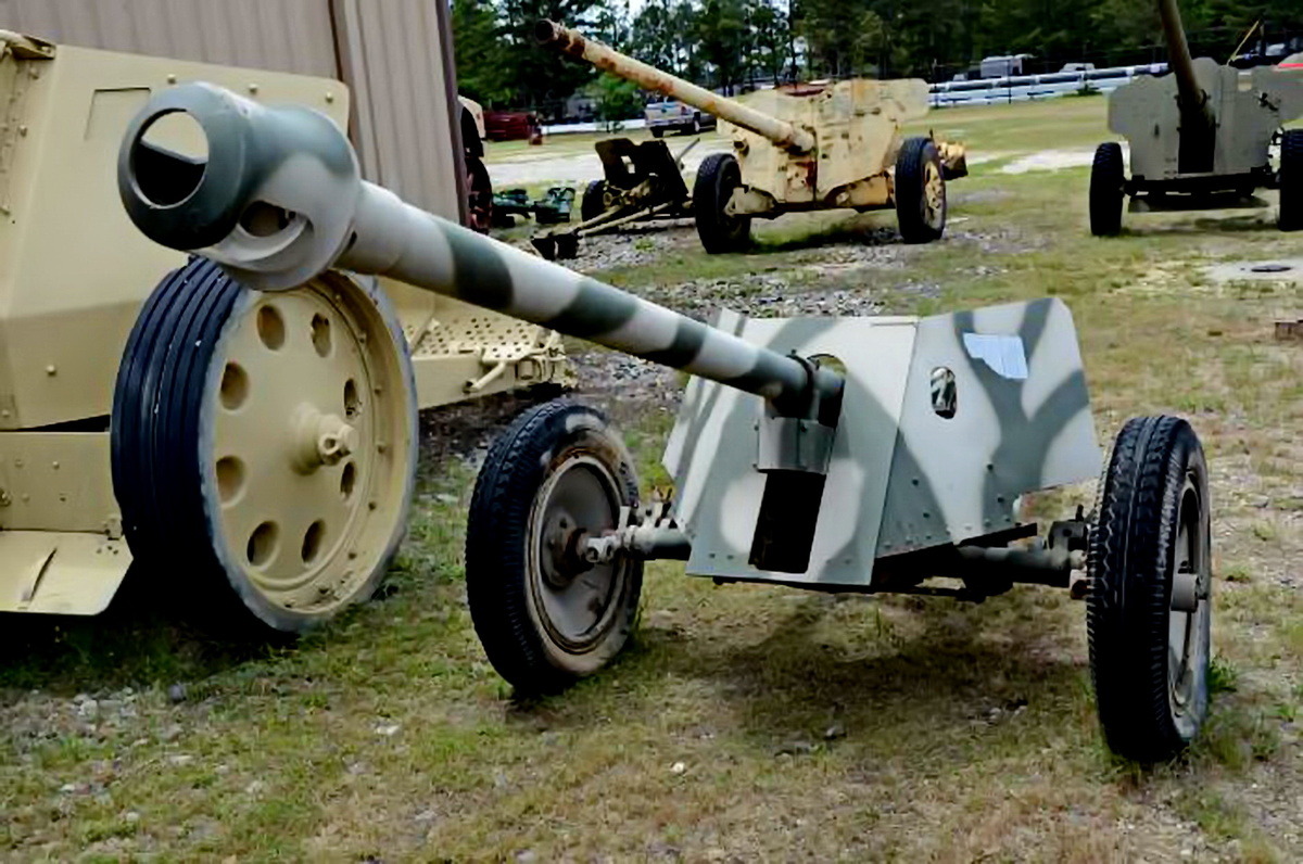 На 2-х фото ниже: ещё одно ПТО 8Н63 – музейный экспонат. Сохранность этой арт. системы хуже, чем арт. системы хранящейся в музее Абердинского полигона (США). У орудия полностью «новодельный» колёсный ход. На обратной стороне щита видны «карманы» под ящики с прицелом и различным ЗИПом. Рядом с ПТО 8Н63 стоит 88-мм ПТО Рак 43/41. Посмотрите, какая разница в размерах и в чисто визуальной массивности орудия Рак 43/41 по сравнению с орудием 8Н63!