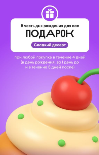Мало кто знает об этой крутой акции ВкусВилл для всех клиентов-именинников, в том числе и для тех кто покупает в магазине много и часто. Но каждый покупатель может получить сладкий десерт ВкусВилл в подарок. При покупке в свой день рождения на любую сумму, за 1 день до дня рождения и в течение 3 дней после него, вам бесплатно подарят десерт (пирожное или небольшой тортик). Если в магазине отсутствуют десерты, участвующие в акции, на момент покупки, то вам будут начислены 300 бонусов (300₽) на карту лояльности, которые вы сможете списать при следующей покупке. Для участия в акции необходимо: Мне в подарок привезли морковный тортик с пеканом, вкусный и полезный, а главное, совершенно бесплатный. Сохраняйте акцию, делитесь ею с друзьями, пользуйтесь! Еще больше скидок и акции на портале по ссылке.