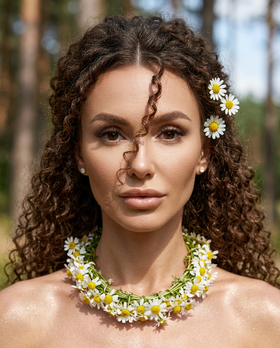 Промпт: Экстремально крупный план портрета: лицо + верхняя часть шеи и немного плеч. Камера почти вплотную, фронтальный ракурс, женщина по центру кадра, смотрит прямо в объектив. Выражение спокойное, созерцательное. Съёмка на улице - небо; фон полностью размытый (сильное боке), малая глубина резкости.