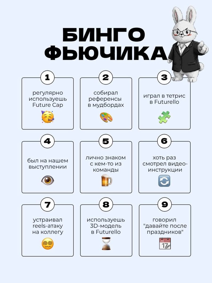 Ты настоящий друг Фьючика, если можешь поставить галочку хотя бы в нескольких клетках Напиши в комментариях свой результат: сколько из 9 у тебя есть? 😠 Пример: 9/9, 7/9, 3/9 и т.д.
