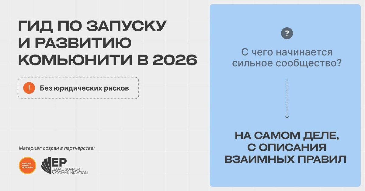 ! Но обо всем по порядку, рассказываем🙂↕️ Месяц назад к нам пришли друзья из агентства «В одно рукопожатие» с интересным вопросом: «а как вообще безопасно развивать комьюнити с юридической точки зрения?» И чем глубже мы начали это обсуждать, тем яснее стало, что тема гораздо шире, чем кажется. Ведь комьюнити — это не просто «добавить людей в чат», если смотреть на это как на полноценный бизнес-процесс ❗️Комьюнити = деньги, персональные данные, пользовательский контент, реклама, правила взаимодействия и ответственность организатора И мы поняли, что об этом почти нигде не говорят простым и понятным языком. Нет материала, который бы собрал все правила в одном месте Поэтому мы решили объединить ресурсы двух агентств и вместе с «В одно рукопожатие» создали большой совместный материал для тех, кто строит сообщества Гид о том, как создавать, развивать и масштабировать комьюнити безопасно и без лишних рисков в 2026 году📎 Внутри собрали то, что сами хотели бы видеть как ориентир: —
