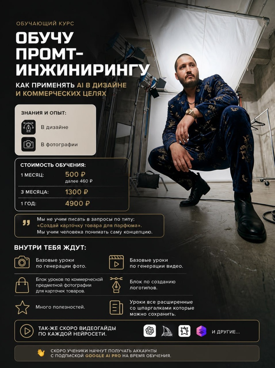 🟢🟢🟢🟢🟢🟢 🔔 ⚡ Заходи к нам в бесплатную группу где мы общаемся, обучаемся, делимся опытом и соревнуемся. Ссылка на бесплатную группу. 🟢🟢🟢🟢🟢🟢🟢🟢🟢🟢 Для тех кто хочет выйти на доход в сфере фриланса у нас есть платная группа с уроками и советами от дизайнера-фотографа с многолетним стажем. 🔥Так же помимо уроков, на время обучения ты получишь не ограниченный личный доступ к топовым нейросетям от Goggle. Nano Banana PRO, Veo. Ссылка на ознокомление и покупку доступа. В чём преимущество перед другими курсами. Мы не учим вас пользоваться чат GPT мы учим вас понимать как всё работает. Мы учим вас творчеству и пониманию как создавать. Делюсь многолетним опытом в сфере дизайна и фриланса. Множество профессиональных навыков. Опыт и знание принципов фотографии. Опыт в сфере монтажа и съёмок. 🔹— Полноценная обратная связь. Помощь в изучении материала. 🔹—У нас большое сообщество где есть множество опытных авторов с реальным заработком в сфере, и где все учатся. А не меряются.