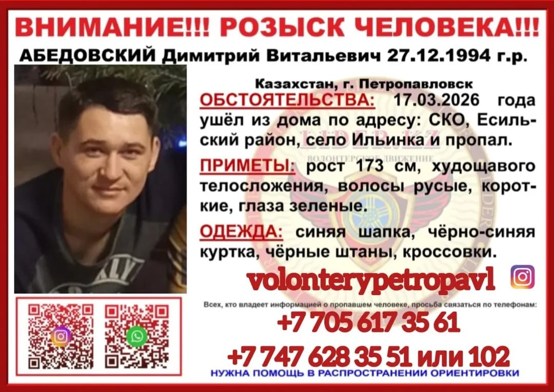 В Северо-Казахстанской области ищут 31-летнего Дмитрия Абедовского. Мужчина пропал 17 марта — он ушёл из дома в селе Ильинка Есильского района и с тех пор не выходит на связь, передает Петропавловск.news. Приметы: худощавого телосложения, рост около 173 сантиметров, короткие русые волосы, зелёные глаза. В день исчезновения на нём была синяя шапка, чёрно-синяя куртка, чёрные штаны и кроссовки. Всех, кто располагает какой-либо информацией о его местонахождении, просят обратиться по телефонам: +7 705 617 35 61, +7 747 628 35 51 или 102. Также волонтёрам нужна помощь в распространении ориентировок.