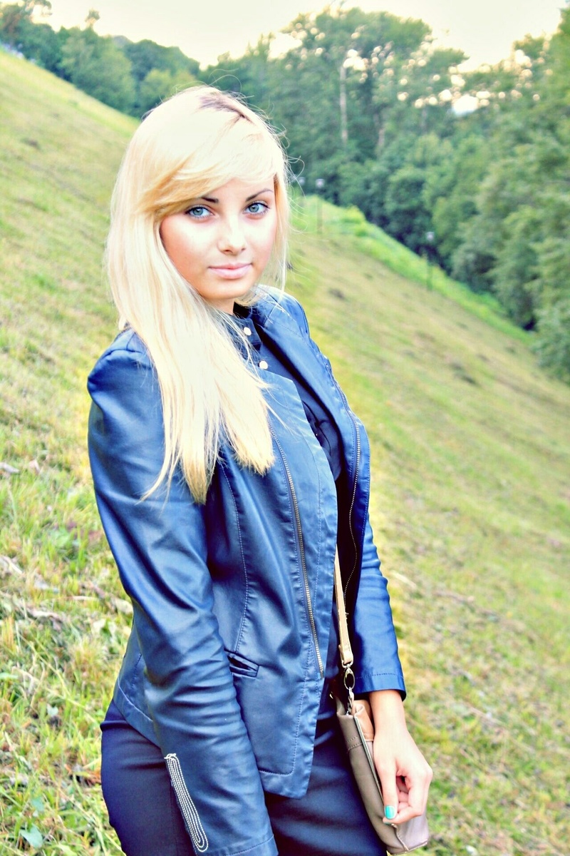 - стильная синяя кожаная куртка-косуха с молниями, подчёркивающая фигуру;