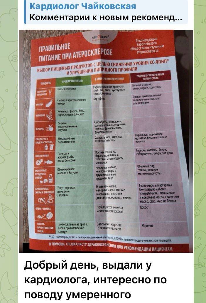 Данная памятка, в общем-то, даёт правильные и полезные советы: ешьте больше цельнозерновых продуктов, овощей, бобовых, рыбы и нежирного мяса. Уменьшите потребление выпечки, колбас, жареной еды и трансжиров. Но есть проблема: она чрезмерно упрощена. В чём же ошибка? Прежде всего в том, что продукты в ней разделены на «хорошие» и «плохие» колонки, как будто одни продукты способны "лечить" сосуды, а другие — вредят. Но это не так! Ведь важнее не конкретный продукт, а общий дневной рацион, количество потребляемых калорий, есть у вас избыточный вес, каков уровень «плохого» холестерина (ЛПНП), есть ли у вас диабет, гипертония, проблемы с сердцем или семейная гиперхолестеринемия. 🧈Сомнительно выглядит раздел с жирами и заправками. Оливковое масло в памятке стоит в одном ряду с майонезом, кетчупом и маргарином — «есть в меру». Но это неправильно! ✅ Оливковое масло — предпочтительный жир, особенно если заменяете им сливочное масло, сало, жирные соусы, пальмовое и кокосовое масло. ⚠️ Но это н