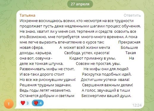 ! 🥰 Татьяна пишет: 😌Искренне восхищаюсь всеми, кто, несмотря на все трудности, продолжает пусть даже медленными шагами процесс обучения. Не знаю, хватит ли у меня сил, терпения и средств освоить все это. Возможно, мне потребуется много-много времени. А пока мне легче выразить впечатление о курсе так: Прекрасная новая сфера, А может всей жизни мечта Большие доходы, карьера, Свобода, успех, красота! Такая она вот, озвучка — Кидают приманку в умы. На деле же тонкая штучка, Совсем не простая, увы. Развенчивать мифы не стоит, Не мифы они для людей И все-таки дорого стоит Раскрутка подобных идей. Но все же рискнувшим удачи! Достигшим успеха — хвала! Решения трудным задачам, Свершения важным делам! Ведь годы летят незаметно, А голос, звучащий в тиши Останется добрым и светлым Бессмертием вашей души.🖋️ ❤️ Татьяна, спасибо вам за эти строки. Они про то, о чём молчат многие: что путь в озвучку — не всегда лёгкий, но он того стоит. И если вы сейчас сомневаетесь или устали — просто знайте