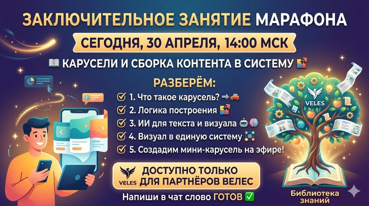 ! 😊 Сегодня, 30 апреля, в 14:00 МСК встречаемся в чате «Библиотека знаний» на седьмом завершающем занятии марафона. Тема встречи: Карусели и сборка визуального контента в систему 📚✨ На занятии разберём: ✔️что такое карусель и как она ✔️работает в соцсетях; ✔️как строится её логика; ✔️как использовать ИИ для текста и визуала; ✔️как собрать весь визуальный контент в единую систему; ✔️и создадим мини-карусель прямо в процессе эфира 🙌 Занятие доступно только для партнёров команды Велес. Если вы планируете присоединиться, напишите в чат слово ГОТОВ 💬 Будет очень практично, понятно и полезно 💛