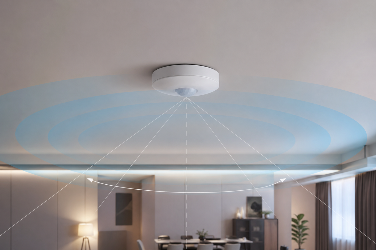 Выбор между потолочным и настенным датчиком почти всегда делают «по внешнему виду» или «как удобнее поставить», а не по логике покрытия и сценария использования, из-за чего система либо пропускает движения, либо наоборот даёт ложные срабатывания. Разница между ними не косметическая, а в геометрии работы и именно она определяет, будет ли свет включаться стабильно или раздражать. 1. Потолочный датчик покрывает всё пространство и лучше работает в центре комнаты