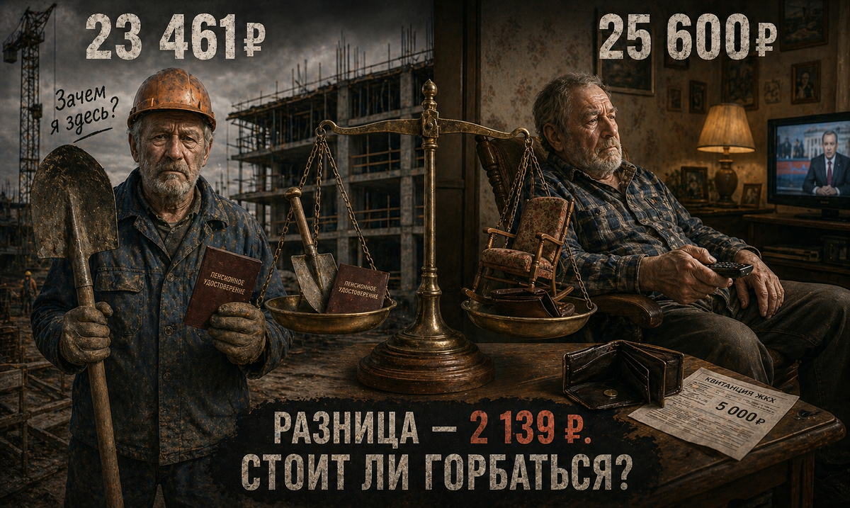 Ирония №2: Государство создало систему, в которой пенсионеру невыгодно работать официально. Разница между «работаю» и «не работаю» — 2 139 рублей. При этом работающий пенсионер платит НДФЛ (13%), тратит время и силы на дорогу и работу. Зачем? Понятно зачем — потому что 23 461 рубль — это всё равно мало, а 25 600 — тоже мало. Но 2 139 рублей — это не те деньги, ради которых стоит горбатиться. По крайней мере, по мнению многих пенсионеров. Но они всё равно работают. Потому что деваться некуда.