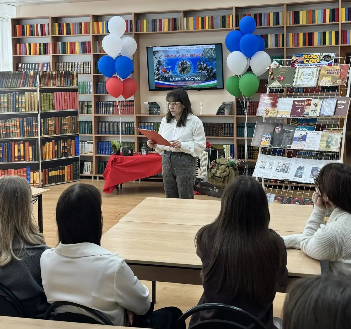 29 апрельдә Үзәк шәһәр китапхаләр системасында «Фронт һәм тыл бергә: Башкортстан Бөек Ватан сугышында һәм Махсус хәрби операциядә» дип аталган Республика тарихи-патриотик марафонына тантаналы старт бирелде. Чара Русия Федерациясе һәм Башкортстан Республикасы гимннарын башкару белән башланып китте. Баш методист Ольга Габделхакова кунакларны сәламләп, марафонның максатлары һәм бурычлары белән таныштырды. Программа бай эчтәлекле һәм төрле яшьтәгеләргә юнәлтелгән иде. Китапханәдә «Вакытлар бәйләнеше» күргәзмәсе эшләде. Төп вакыйга булып китап экспозициясе торды. Ул заманча авторларның батырлык елъязмасын ничек дәвам итүләрен ачык күрсәтте. Олег Рой, Дмитрий Семёнов, Михаил Фёдоров әсәрләре — ул бары тик әдәби әсәрләр генә түгел, ә чор шаһитлекләре. Аларның китапларында Бөек Ватан сугышындагы һәм махсус хәрби операциядәге батырлык, фаҗига һәм төрле һөнәр ияләре язмышлары: очучылардан алып оператор-дроннарга кадәр, штурмчылардан алып элеккеге милиция хезмәткәрләренә кадәр үрелеп бара. Һәр