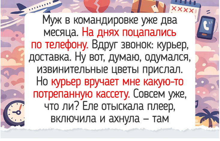 - Муж в командировке уже два месяца. На днях поцапались по телефону. Вдруг звонок: курьер, доставка. Ну вот, думаю, одумался, извинительные цветы прислал. Но курьер вручает мне какую-то потрепанную кассету. Совсем уже, что ли? Еле отыскала плеер, включила и ахнула — там его свадебная клятва. Свекровь записала наши клятвы еще во время свадьбы, а муж знал, но все случая не находил забрать. А тут решил, что случай как раз подходящий, поэтому попросил маму отправить мне. Это было так романтично — в сто раз круче, чем любые цветы и подарки. @ ADME