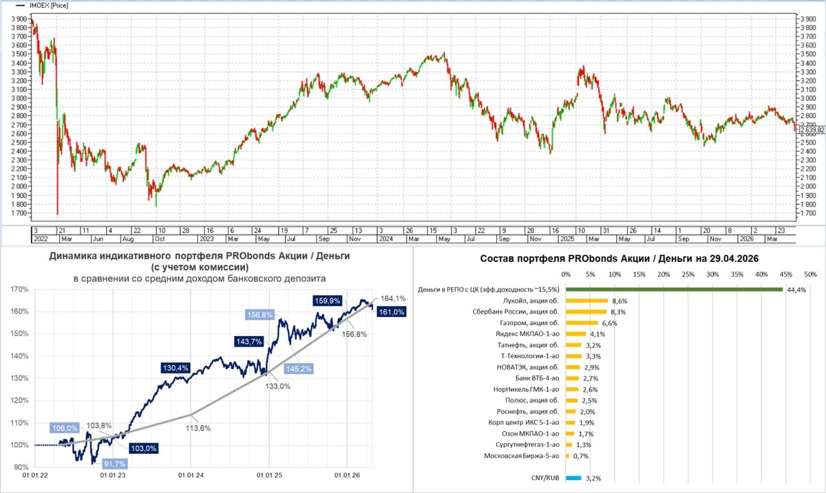 Когда падение рынка идет в относительной тишине, без нагнетания и паники, это падение, вероятно, продолжится. А паника лишь впереди. Это то, что происходит с российскими акциями последние полтора месяца. Против энтузиазма от войны в Иране и роста нефтяных цен встали проблемы с нефтепереработкой, хранением и транспортировкой. А против дешевизны – фиксация слабых отчетностей, понимание уязвимости прав собственности и непонимание перспектив. Или недостаток денег, которые саккумулированы на депозитах, в недвижимости и в облигациях. На этом фоне результат портфеля PRObonds Акции / Деньги за последние 12 месяцев, 4,8%, ушел ниже официальной инфляции (5,7%). Индекс МосБиржи за то же время — -13% (или -3% с дивидендами). Повторю мысль, которую уже высказывал. Акции – опережающий индикатор общего экономического состояния. Как, впрочем, и сверхдорогие деньги для эмитентов высокодоходных облигаций (формулой купона «ключ + 10%» уже никого не удивишь). В противовес рубль остается незыблемым, потому