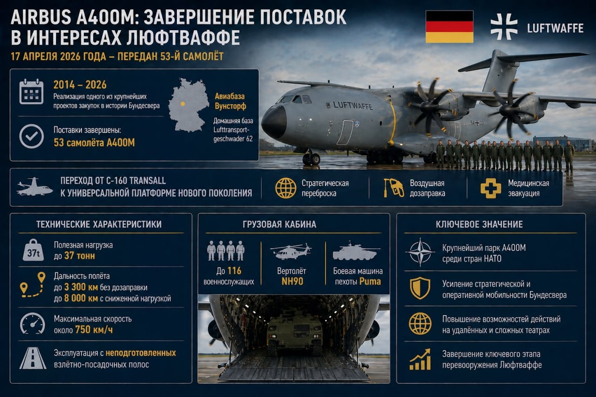 завершила один из крупнейших проектов закупок в истории Бундесвера, реализуемый с 2014 г. Программа A400M формировалась как ключевой элемент перехода от ограниченных возможностей тактической авиации периода C-160 Transall к универсальной платформе, способной решать задачи стратегической переброски, воздушной дозаправки и медицинской эвакуации. С завершением поставок Германия располагает крупнейшим парком A400M среди стран НАТО — 53 самолёта, сосредоточенные в составе 62-го транспортного авиационного крыла (Lufttransportgeschwader 62). Тем самым Германия получила платформу, способную интегрироваться в многоуровневые операции НАТО, включая переброску сил на восточный фланг, обеспечение экспедиционных миссий и поддержку союзных контингентов. Одновременно Airbus реализует проект создания центра технического обслуживания A400M непосредственно на авиабазе Вунсторф. Ввод объекта в эксплуатацию запланирован на середину 2027 г., штат — около 300 специалистов. Подробнее читайте в материале