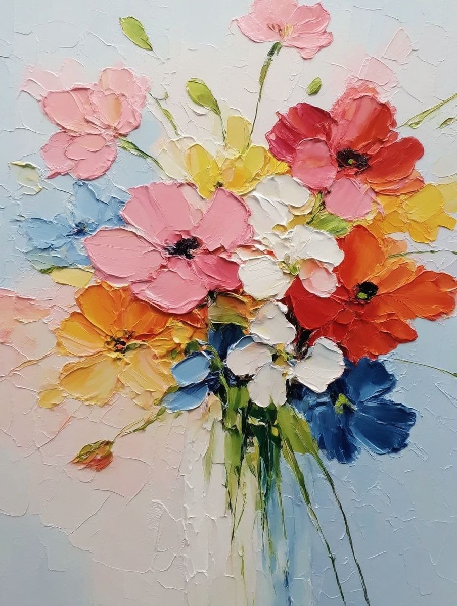 https://s.mj.run/38wXcHLy4Pc This is an abstract expressionist painting of flowers, created using a rich palette knife technique with soft pastel colors and brushstrokes. The painting features a white background with pink and blue as the main colors, creating a beautiful and charming bouquet in a vase. The colors encompass pink, orange, yellow, white, and blue. The painting employs an impasto technique, with thick brushstrokes that produce a rich and vibrant effect. --chaos 30 --ar 3:4 --sref https://s.mj.run/EGRMPkSrS9I --profile ix84zud --stylize 300 --draft #Нейросолнце@neo_neurosun #Midjorney