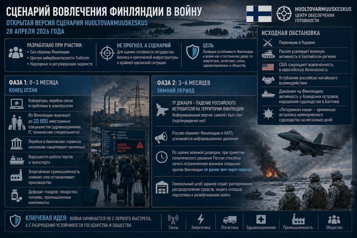 вовлечения Финляндии в войну (прим. - позже материал все же удалили с сайта). Первый вариант был подготовлен в 2025 году для структуры обеспечения национальной устойчивости, в которую входят около 1500 компаний и десятки государственных органов. В разработке участвовали эксперты Сил обороны Финляндии (ГШ и МО), Центра кибербезопасности Traficom, а также надзорных и регулирующих ведомств. Логика документа строится вокруг войны не только как столкновения вооружённых сил, а как удара по энергетике, логистике, связи, здравоохранению, промышленности и общественной устойчивости. Сценарий разворачивается начинается в конце лета 2026 года. В сценарии война на Украине завершается перемирием, Россия усиливает военную активность в Балтийском регионе, а США сокращают вовлечённость в европейскую безопасность. Одновременно углубляется российско-китайское взаимодействие. На этом фоне растёт давление на Финляндию, включая активность в районе Аландских островов и нарушение судоходства в Балтийском