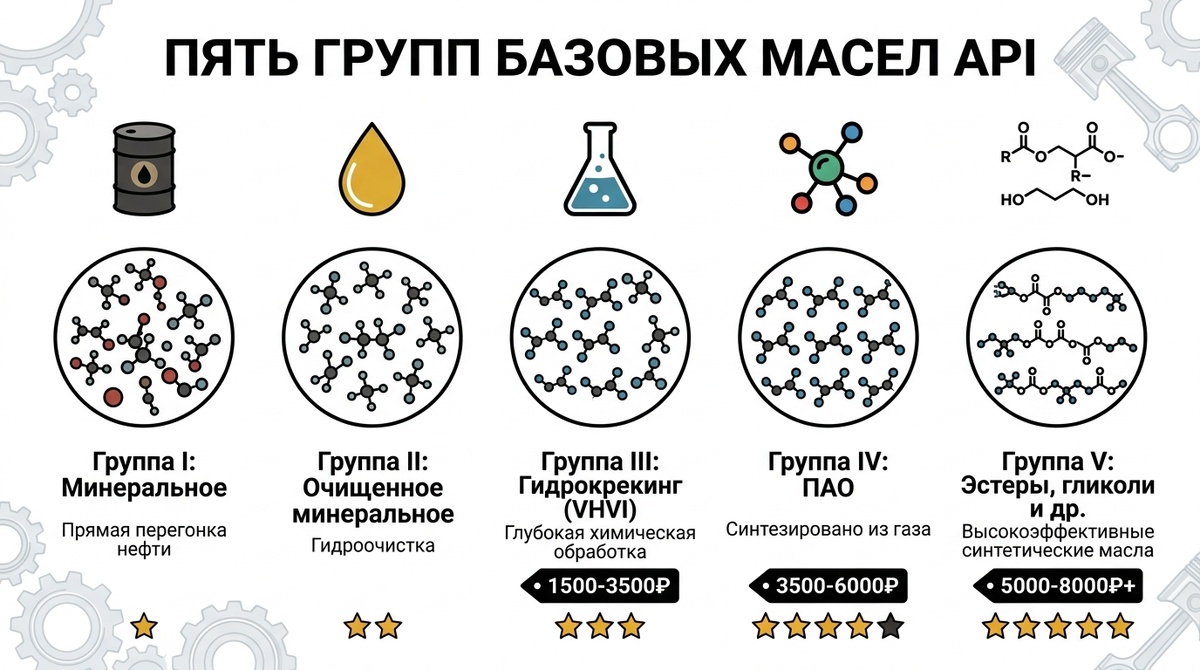 Группа V — всё остальное, что не входит в группы I–IV: эстеры, алкилированные нафталины, полиалкиленгликоли и другие соединения. Самые дорогие и технологичные компоненты. Именно они отличают премиальный продукт от хорошего.