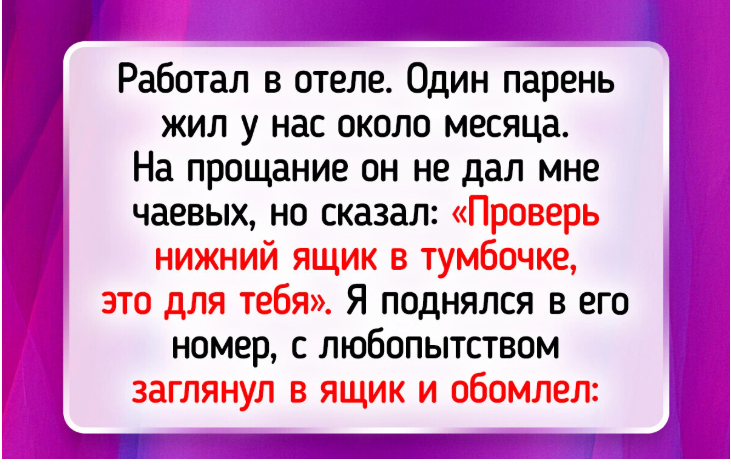 Работал в отеле. Один парень жил у нас около месяца. На прощание он не дал мне чаевых, но сказал: «Проверь нижний ящик в тумбочке, это для тебя». Я поднялся в его номер, с любопытством заглянул в ящик и обомлел: он был полон монетками по 5 и 10 центов на общую сумму 40 долларов. Это было самое странное, что я когда-либо видел, но это были хорошие чаевые.