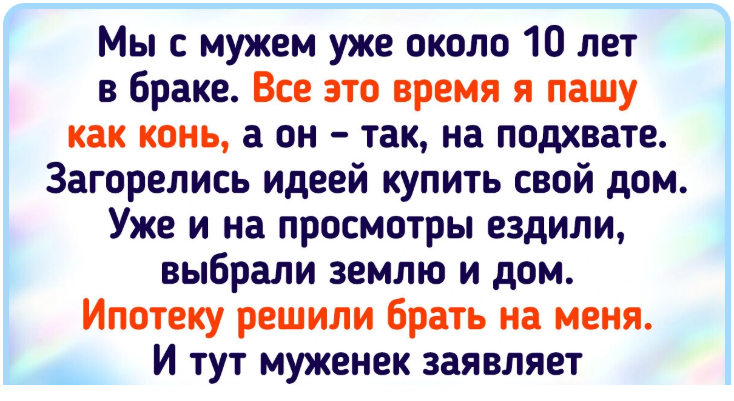 Мы с мужем уже около 10 лет в браке. Все это время я пашу как конь, а он — так, на подхвате. Загорелись идеей купить свой дом. Уже и на просмотры ездили, выбрали землю и дом. Ипотеку решили брать на меня. И тут муженек заявляет, что хочет сделать брачный договор, мол, он боится после развода остаться ни с чем и хочет, чтобы в случае чего дом остался у него. Я, честно говоря, в шоке.