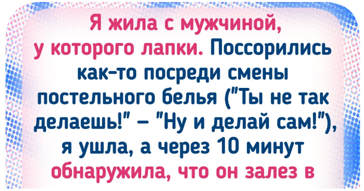 Я жила с мужчиной, у которого лапки. Поссорились как-то посреди смены постельного белья ("Ты не так делаешь!" — "Ну и делай сам!"). Я ушла, а через 10 минут обнаружила, что он залез в пододеяльник и там запутался: этот гений решил, что надо впихнуть одеяло комом, а потом залезть внутрь и его там расправить. А потом я вышла замуж за другого. Съехались мы, в новой квартире не было кухни. Стали планировать ее и поругались: он настаивал на определенных решениях, а я так не хотела, неудобно. Его злило, что я невнимательна к его пожеланиям, меня — что он лезет со своими планами туда, где ничего не будет делать (как упомянутый выше бывший). Через 3 дня выяснилось, что муж, оказывается, тоже собирался готовить! Мне и в голову не пришло, что мужчина прикоснется к плите. А он, бедный, искренне пытался соорудить кухню, на которой готовить будет удобно обоим. Готовит муж действительно не реже, чем я. Вот к чему приводят 12 лет жизни с бытовым инвалидом, которому мама всю жизнь даже креветки чистила. © EinfachesMadel