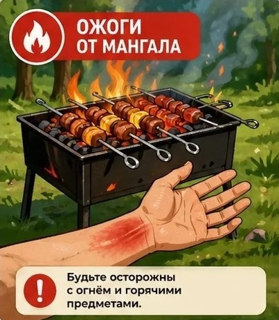 - Однозначно, лидируют ожоги. Это и ожоги от костра, и ожоги от горячих углей, и даже солнечные ожоги, если люди забывают о защите кожи. Далее идут травмы конечностей – растяжения связок, вывихи, переломы, часто связанные с активными играми, падениями на неровной местности или неосторожным обращением с инструментами при приготовлении шашлыка. Не стоит забывать и о пищевых отравлениях, которые возникают из-за несоблюдения правил гигиены при приготовлении пищи или употребления некачественных продуктов.
