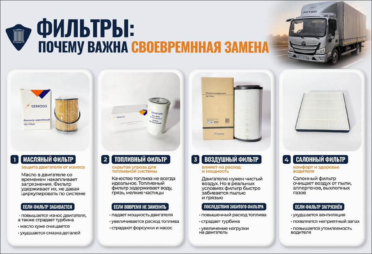 • повышается износ двигателя, а также страдает турбина 2. Топливный фильтр — скрытая угроза для топливной системы Качество топлива не всегда идеальное, особенно при больших пробегах и дальних рейсах. Топливный фильтр задерживает воду, грязь, мелкие частицы. Если его вовремя не заменить: