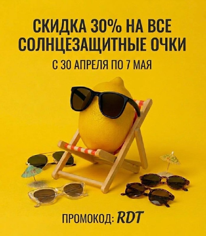 ! ❤️ В наших магазинах действует скидка 30% на абсолютно все солнцезащитные очки 🕶 Просто назовите на кассе промокод: RDT ▶️Акция действует с 30 апреля по 7 мая. Ждем вас на примерку! 🍋
