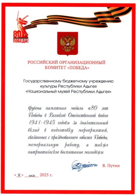 Национальный музей Республики Адыгея получил памятную медаль «80 лет Победы в Великой Отечественной войне 1941–1945 годов» от Российского