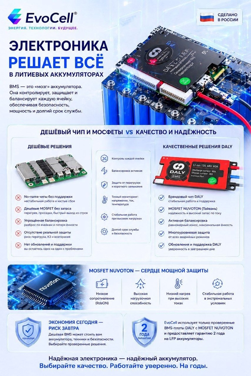 Но это та электроника, которая спасает ваш дрон/самокат/дом от пожара и резкого падения 🔥 Для многих аккумулятор-это просто прямоугольная коробка, но литиевый аккумулятор имеет довольно сложную структуру защиты, если мы говорим о надёжных и безопасных решениях Этот мозг — BMS (Battery Management System). Маленькая плата, которая работает 24/7 и спасает вашу технику. И сегодня расскажу, почему вашему мощному дрону нужен суперкомпьютер, а фонарику — простая защелка. 🧠 Что такое BMS и с чем её едят? Представьте, что ваша батарея — это оркестр, в котором все должны играть строго одинаково. BMS — дирижёр. Он следит, чтобы никто не перезарядился, не разрядился в ноль и не перегрелся. Без него литий — это маленькая бомба замедленного действия. ⚠️ Задача №1 — не дать сгореть. BMS смотрит за напряжением каждой банки. Выскочило за 4.2В — отрубает зарядку. Упало ниже 2.5В — отрубает разряд, оставляя аварийный запас. Ещё и температуру замеряет: нагрелись банки выше 60°C — BMS объявляет перек
