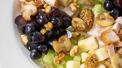 Хотите удивить себя и родных новеньким вкусом? Ловите рецепт обалденного салата! Салат Вальдорф - идеально подходит как для праздничного стола, так и для лёгкого запоминающегося ужина: готовится за 15 минут, выглядит изысканно и, уверен - понравится всем без исключения. Яблоко очищаем от кожицы, нарезаем небольшими кубиками и отправляем в миску с холодной водой, подслащенную сахаром. Грибы разрезаем вдоль на две части и обжариваем до румянца на растительном масле. Для более яркого вкуса, рекомендую при жарке грибов добавить один зубчик чеснока...