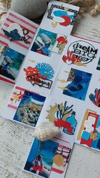 Всем привет! Я уже публиковала видеообзор этого миника. А теперь давайте посмакуем фото подробности. Миник сделан из одного листа, если не считать обложку. Последняя украшена достаточно лаконично, но здесь есть свой секрет. В красном конверте спрятались фотоснимки, которые не влезли в альбом, и билет в океанариум. Собственно миник как раз про поход на данное мероприятие. Спинка тоже красивая! В минималистичном стиле. Альбом опоясывает бархатная лента белого цвета. Внутри интересная конструкция...