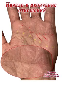 Линия брака, пример. Окончание "вилочкой" указывает на расставание. Начало "вилочкой" указывает на трудности в начале пути отношений, тут могут быть против родственники, либо партнер находится в отношениях. Веточки направленные вверх указывают на занятость партнера, это может быть работа. Ваша Татьяна Чурон т. 8-904-355-08-09 @Hiromant_Tatiana_Chyron ТГ - t.me/...ana ВК - vk.com/...754 #хиромантия #линии #знаки #судьба #начало #чурон #высокое #низкое #холм #любовь #хирология #Москва #цели