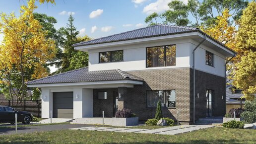 Проект дома AMIKA-2. Этот проект делался как продолжение всеми полюбившегося проекта GRAF с плоской крышей. Но визуально, все же он не стал похож на классический дом с шатровой крышей. И мы причислили его к серии AMIKA...