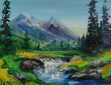 Довела июньский этюд с натуры. Тишина и беспрерывные успокаивающие птичьи песни ласкают душу. Атмосфера покоя помогает забыть о проблемах. В июне всё зелёное, но цветов ещё не так много, как в начале июля. Зелень лечит. Иногда думаю - хорошо, что в нашем лесу нет медведей...