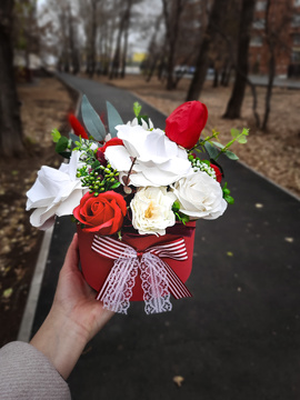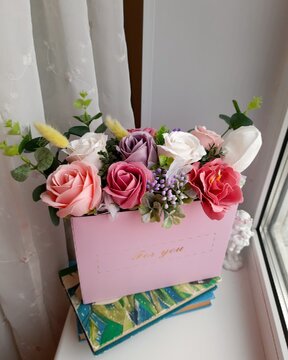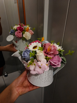 Нежная цветовая гамма! Все бутоны созданы из мыльных роз и радовать они будут более 1,5 лет. Абсолютно гипоаллергенны! Мыться я не рекомендую, хотя они прекрасно мылятся! Больше таковой букет подходит как...