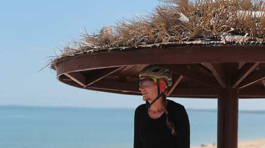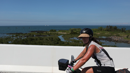 День 12. 7 октября. Трек Осталось 2 дня и хотелось бы доехать своим ходом, но как пойдет. Утром дождь не перестал и периодически нас поливал. Окончательно распогодилось в 9:30. До этого мы успели погулять по волнам и пофотографировать тренирующихся серфингистов. Температура сегодня держалась 30-32 градуса. Встречный ветер тормозил нас до скорости в 13-14 км/ч. Далее мы заезжаем на полуостров - так же курорт, как и большинство на восточном побережье, хотя официальный туристический маршрут объезжает это местечко...