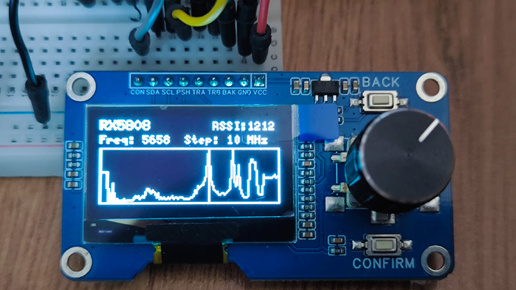 Он позволяет автоматически сканировать диапазон частот, отображать уровень сигнала (RSSI) и визуализировать результат на OLED-дисплее.
