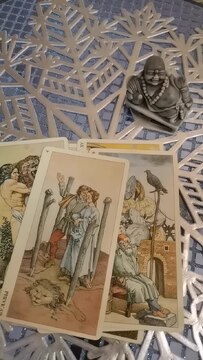 Здравствуйте. Давайте посмотрим какие черты вашего характера, объединенные в лучшие личные архетипы, помогут вам решить проблему, улучшить качество своей жизни. Интуиция выбрала 3 карты. Первая - ИМПЕРАТРИЦА. Женщина, пребывающая в балансе интуитивного и рационального. Она адаптирована в социуме, реализована в большинстве общепризнанных сфер жизни. На этой карте она особенная. Потому что отвернулась от шахматной доски, на которой не помещается ее конструкция в форме цитадели или Эйфелевой башни...