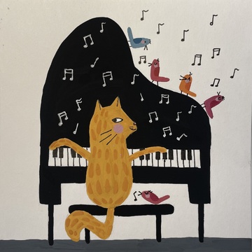 Делаем набросок. Пианино и стул к нему закрашивает черным цветом. Кота делаем рыжим. Не забываем про серый пол. Прокрываем птичку сначала основным цветом, в данном случае голубым. Затем добавляем темное крыло и розовую щечку...