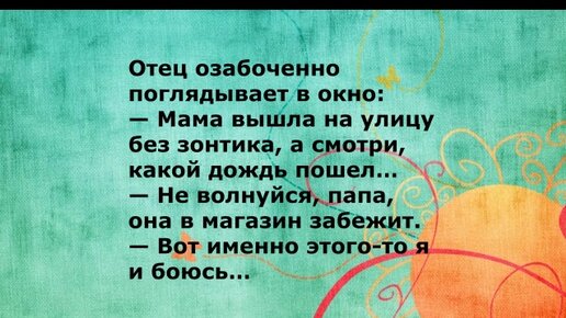 02:161,0×00:00/02:16Отец озабоченно поглядывает в окно: - Мама вышла на улицу без зонтика, а смотри, какой дождь пошел.. Анекдоты37,9 тыс смотрели · 4 года назад